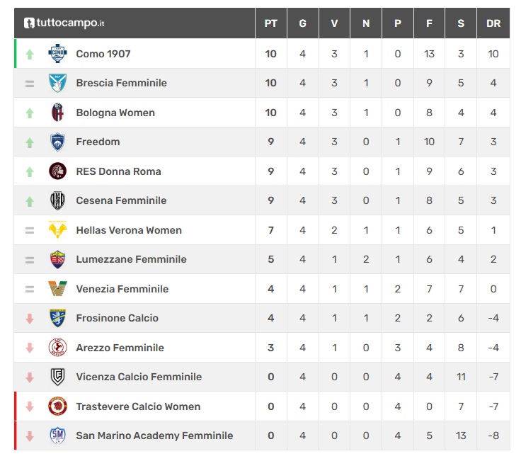 In serie B si “rigioca” l’incontro inaugurale ufficiale dell’avventura in serie B della squadra di Fabio Viviani, considerando l’incrocio di Coppa Italia che lo scorso 31 agosto aveva visto il Trastevere imporsi sul Vcf solo ai calci di rigore nel turno preliminare. Il 2-2 agguantato al 90′ (doppietta di Parodi per le vicentine) non bastò per accedere al tabellone principale con le big del calcio rosa italiano. Domenica, a Grisignano, si replica ma a campi invertiti (15.30 il via) e stavolta con in palio i tre punti. La squadra di casa arriva alla sfida tra cenerentola dopo il ko pesante contro l’altra romana del Res Donna, maturato in una ripresa da black-out dopo un primo tempo concluso in vantaggio 1-0 in trasferta, grazie alla rete di Boaretto, Quattro, però, le reti incassate in poco più di 20′ nella seconda parte di partita, come quattro sono le sconfitte in campionato. Ora in casa Vicenza si punta alla svolta.