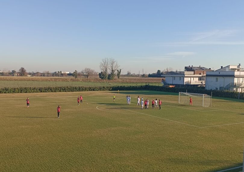 Da segnalare una seconda punizione invitante dai 18 metri affidata ai piedi buoni di capitan “Azzo”, ancora la trasformazione trova però la barriera schierata a respingere (12′). Fase di stanca come occasioni da gol, qualche ritocco dalla panchina in arrivo, l’azione più brividosa arriva dall’avanti destro del fronte di attacco del Carmenta, con Amal proiettato in avanti che in area butta dentro basso un assist al bacio, chiusura difensiva da lode a disinnescarlo. Ci riprovano i padovani, mischia furibonda in area lato destro, Berton che lotta come el leon e alla fine scarica una sassata imprendibile in diagonale sul palo opposto, che sbatte sul legno ed entra in rete per il 2-2 al 38′.