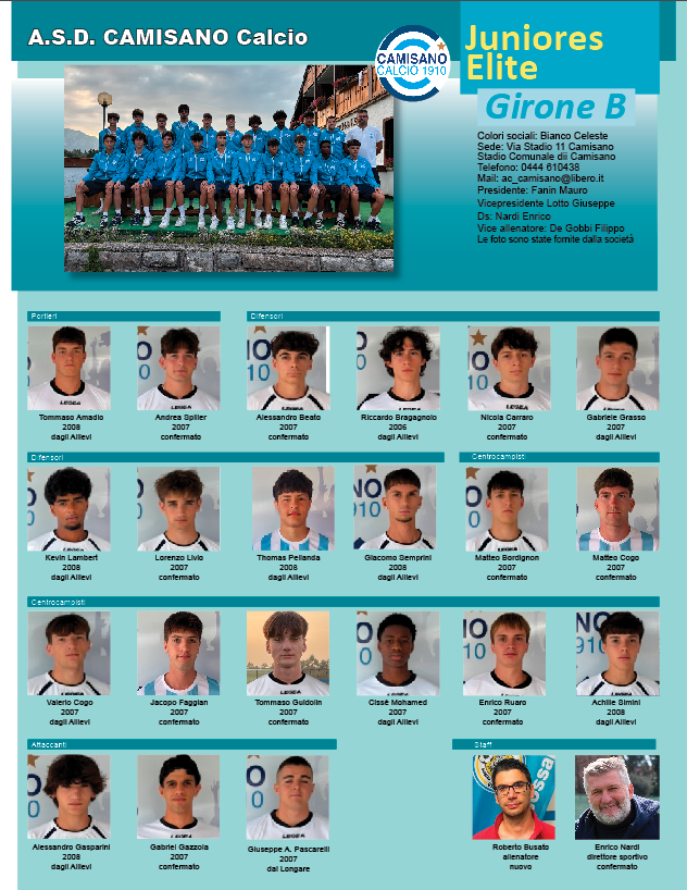 Almanacco Proseguiamo la pubblicazione dell’Almanacco: questa è la pagina del Camisano Juniores Elite con le foto della società;