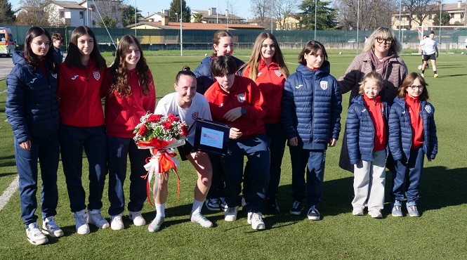 Ieri è stata consegnata a Aurora Missiaggia una targa e un mazzo di fiori rigorosamente biancorossi per le sue 400 partite in prima squadra al Vicenza Calcio Femminile. Nelle foto ci sono alcune delle baby allenate da lei.