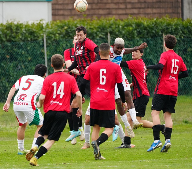 Il secondo tempo si apre con un Thiene più deciso e propositivo. Lovato ci prova con un gran tiro ribattuto dalla difesa. Il vantaggio arriva poco dopo: cross preciso e incornata perfetta di Cervellin, che sblocca il match e porta i rossoneri sull’1-0.
