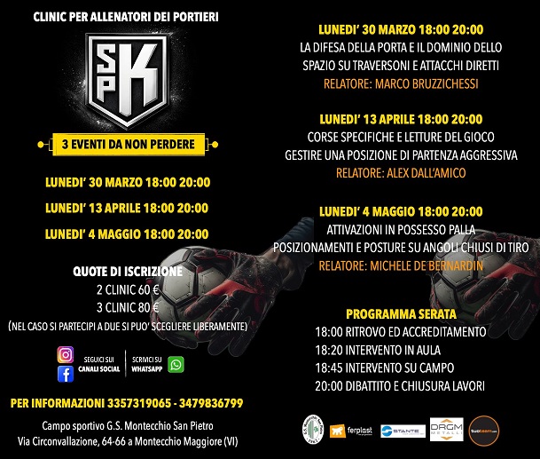 Clinic per allenatori dei portieri: A Montecchio San Pietro si terrano tre sedute per allenatori dei portieri: la prima è in programma per lunedì 30 marzo; gli istruttori sono Marco Bruzzicchessi, Alex Dall’Amico e Michele De Bernardin