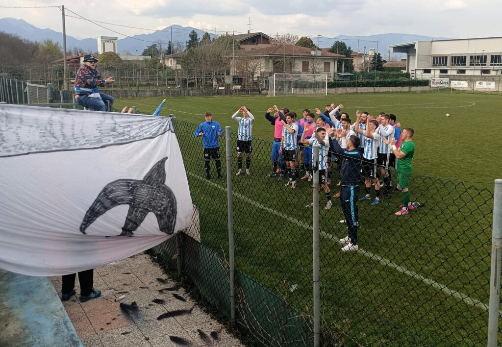 San Tomio che bada per lo più a difendere quello che sarebbe già un punto gustoso come un panin onto dopo 90 minuti di sgroppate in campo, ma che non rinuncia a provarci quando il Summania pecca nel possesso di palla. Ed è dalla mezzora che la partita “gira”. Al 32′ Critelli lotta e serva Comparin che calcia bene, deviazione in angolo. Si replica al 38′, gran sinistro di collo pieno di Battistella, sfiorato da qualcuno e altro corner, sulla cui battuta Renon prende il tempo a tutti e per un soffio non sigla lui il 2-1. Tempo di attendere la nuova battuta, palla crossata come meglio non si può per uno specialista del colpo di testa, il difensore Sanfilippo, stacco da urlo e testata violenta con sfera che schizza in rete pulita. Sagra anticipata San Tomio, tra cori, botti e applausi, e qui si apre un’altra partita che dura quasi un quarto d’ora (saranno 7 i minuti di recupero, accolti con rosari sgranati dai tifosi di casa). Una curiosità, ammoniti tutti e 4 i componenti della linea difensiva biancoceleste.