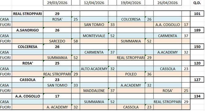 Su tali valori troviamo che il Real Stroppari che parte da 29 punti in classifica ,ha un cammino più semplice sotto l’aspetto del Q.D. valore 101 ma in realtà ha 3 scontri diretti su quattro gare.
