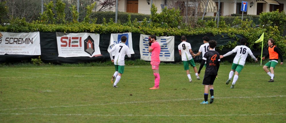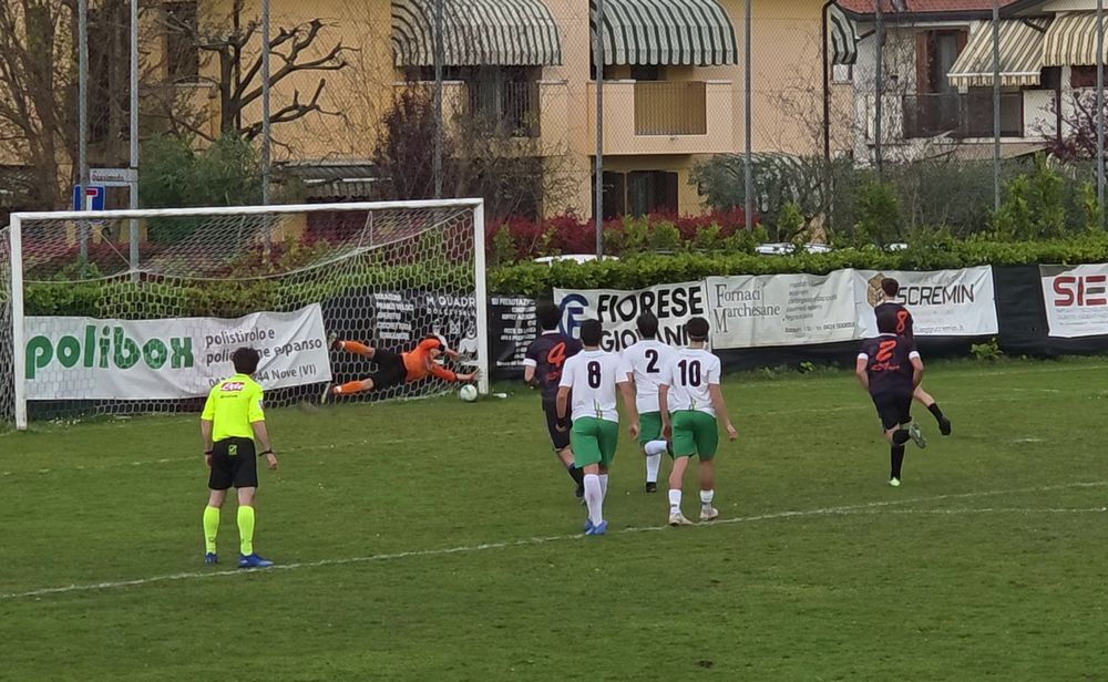 L’arbitro indica senza esitazione il dischetto e dagli unici metri si presenta Leonardo Scremin: nonostante il portiere avversario intuisca la traiettoria, la conclusione precisa si infila nell’angolino per il vantaggio locale che chiude il primo tempo sull’1-0.