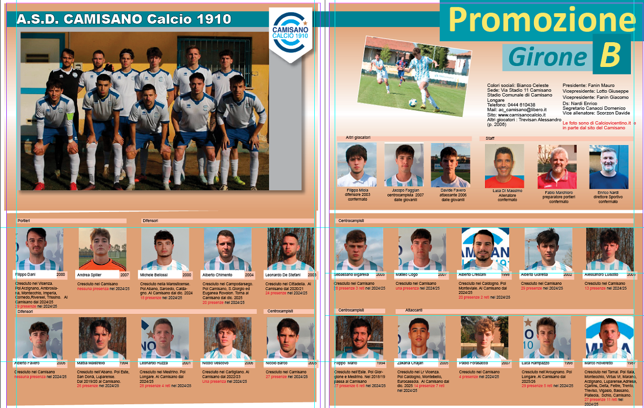 Almanacco Proseguiamo la pubblicazione dell’Almanacco: questa è la pagina in bozza del Camisano con le foto di calciovicentino e in parte fornite dalla società.