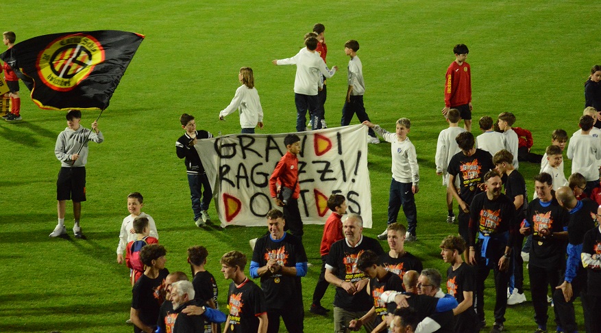 I giallorossi rientrano in campo… e sembrano non esserne mai usciti: venti secondi e Valenta lambisce il montante alla sinistra di Marocchi, trovando comunque un corner per effetto di una deviazione. Il Montecchio Maggiore, punito alla distanza ma comunque tenace, costruisce una grande palla gol al 53’ con la discesa palla al piede di Hicham Arma che semina Crestani ed impegna De Grandis, abile in tuffo a deviare in calcio d’angolo. Pericolo scampato, si torna ad attaccare, si torna ad incantare: all’ora di gioco un preciso cross di Torresan permette a Valenta di realizzare un gol da figurine Panini in semirovesciata. Da giocate del genere si intuisce che è giustamente la serata della festa, del tripudio: la prodezza del croato di fatto sigilla il successo dei giallorossi, che verrà poi arrotondato all’85’ da Michael Meneghetti, abilissimo a dribblare Marocchi e depositare nella porta vuota col piatto del sinistro. E allora, dopo ventotto anni di attesa, alle 20:20 di mercoledì 8 aprile 2026 lo Schio è nuovamente in Serie D.